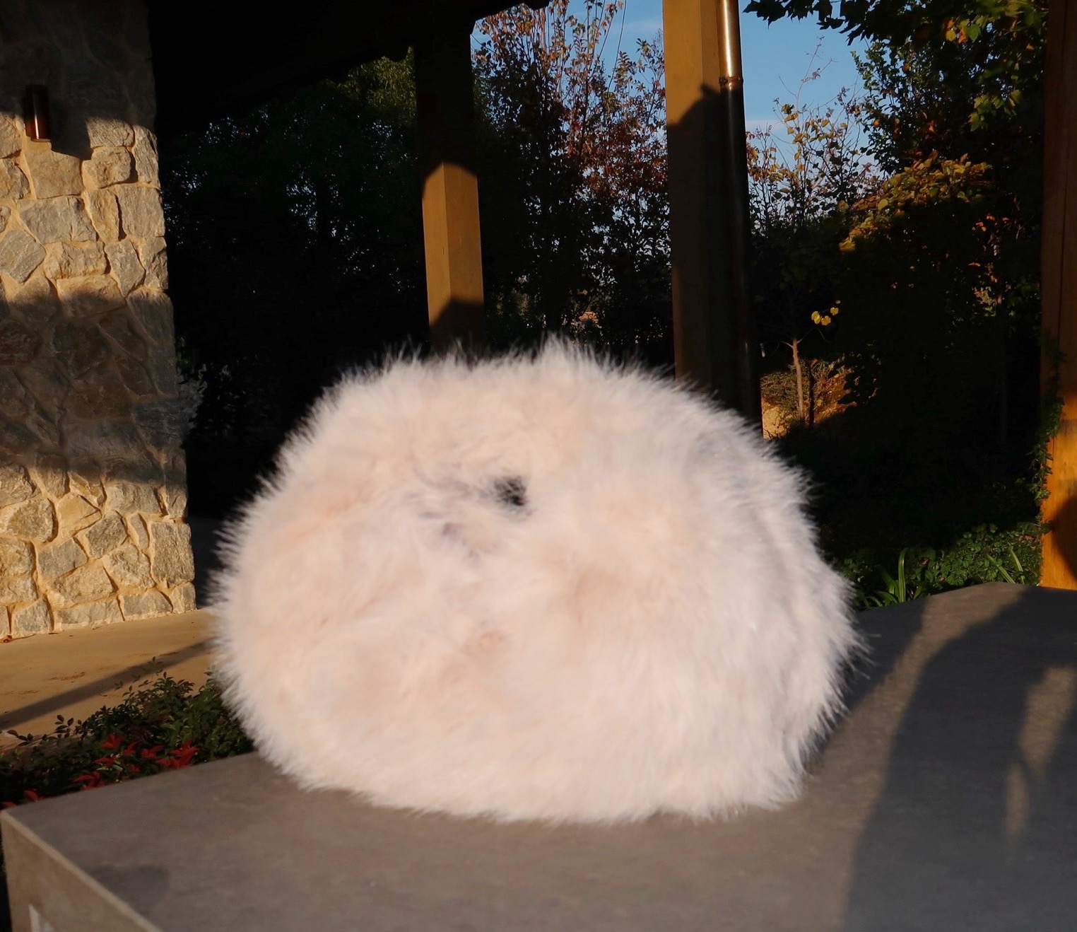 תיק פרוותי על זמני, בגוון שכולו שלמות פודרה ורדרד עדין.